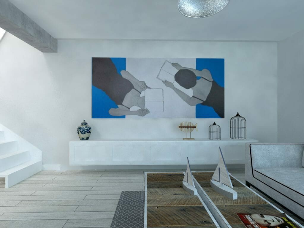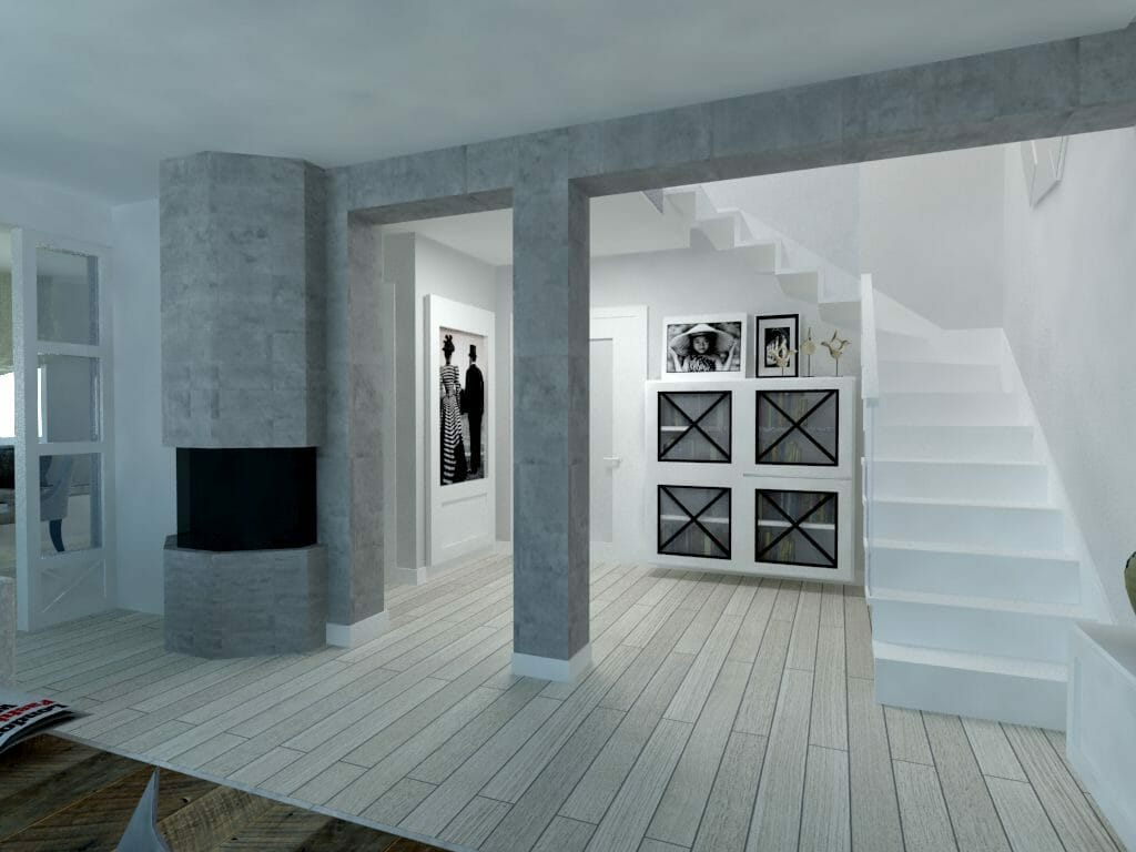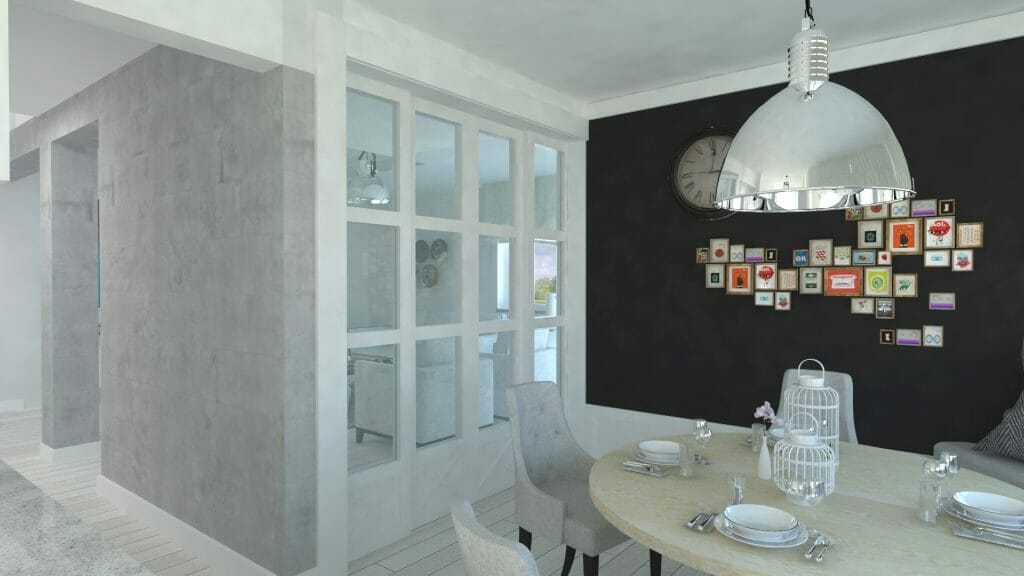 Finalnie powstała ruchoma ścianka przedzielająca ale nie izolują jednej strefy od drugiej, życie domowników nadal współgra, przenika się. To jeden z projektów gdzie klientka i ja jasno określiliśmy kierunek w stylu. Porozumienie towarzyszyło od samego początku, co przelało się na realizację pierwszych szkiców ideowych a potem zakupów i realizacji.