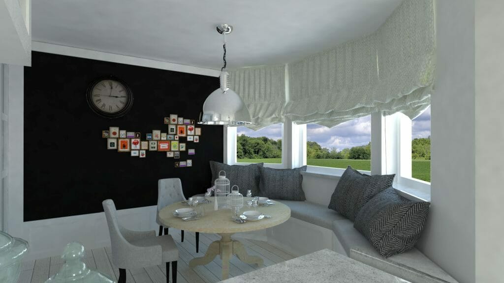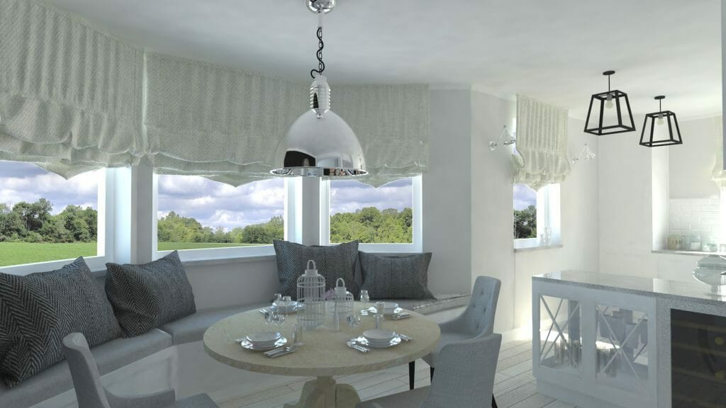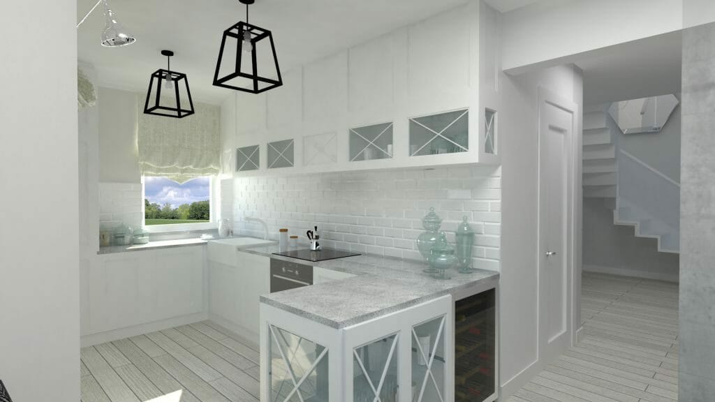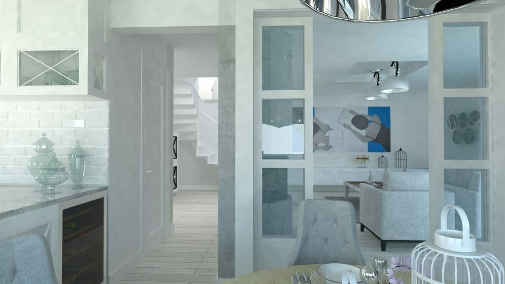 Jednym z marzeń klientki w tym projekcie wnętrz było oddzielenie jadalni od salonu. Otwartą przestrzenią Pani Inwestor już się nacieszyła a teraz potrzebowała zmiany. Moim pomysłem była lekka forma składanych drzwi z przeszkleniem. Kolor szkła nawiązywał do jaśniutkiego niebieskiego, letniego nieba. Styl utrzymałam w nadmorskim klimacie, tak jak zresztą cały projekt domu. Biały kolor oraz półprzeźroczyste szkło z poświatą blue, świetnie ze sobą współgra i jest też jednym z wyznaczników nadmorskiego stylu.